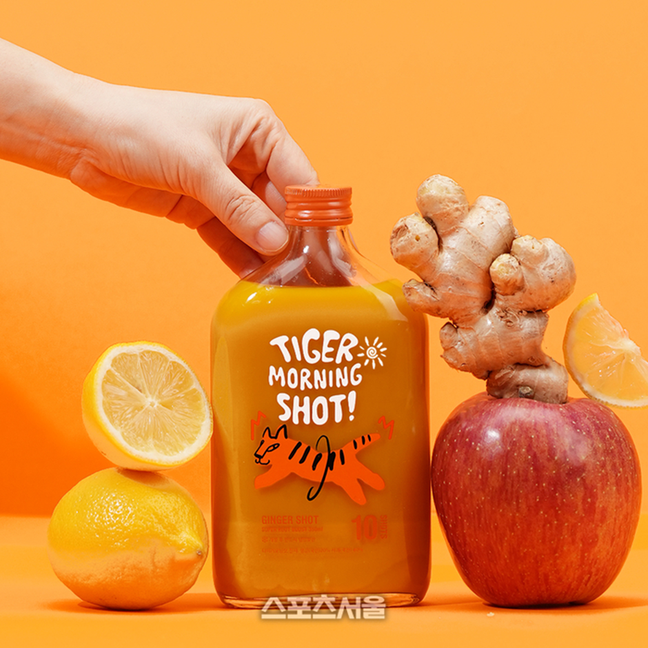 네, 에너지를 채우는 거니까요. 또 중요한 포인트가 있어요. 과채를 원료로 하는 많은 음료 제품들은 원가와 제조/유통의 편리함을 위해 수입산 완제품을 원료로 사용합니다. 타이거 모닝은 최고의 품질을 위해 당해 수매한 신선원료를 직접 착즙하는 방식을 고집합니다. 이미 연간 수백톤 이상의 생강과 사과를 국내 농가와 계약하고 있으며 단일 업체로는 가장 많은 사용량에 속합니다. 건강하고 신선한 제품을 만들기 위한 타이거 모닝의 노력은 이미 지역농가경제 활성화로 이어지고 있다고 할 수 있죠.